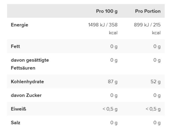 Nehmen Sie je nach Bedarf eine Portion „Waxy Maize Starch“ (40g bis 60g) (ca. 2-3 gehäufte Esslöffel) mit 300 ml Wasser, Milch oder Proteinshake vor und nach dem Training.